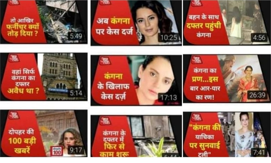 कंगना पर आज तक ने 12 घंटे में यूट्यूब पर डाले 60 वीडियो, बेरोजगारों-किसानों पर एक भी नही