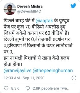 मीडिया की इन्हीं करतूतों को एक्सपोज करते हुए पत्रकार देवेश मिश्रा रात साढ़े 12 बजे एक ट्वीट करते हैं। उन्होंने लिखा- ‘पिछले बारह घंटे में AajTak के यूट्यूब पेज पर कुल 70 वीडियो अपलोड हुए जिसमें अकेले कंगना पर 60 वीडियो हैं। दिल्ली झुग्गी पर 0, बेरोज़गारी प्रदर्शन पर 0, हरियाणा में किसानों के ऊपर लाठीचार्ज पर 0,