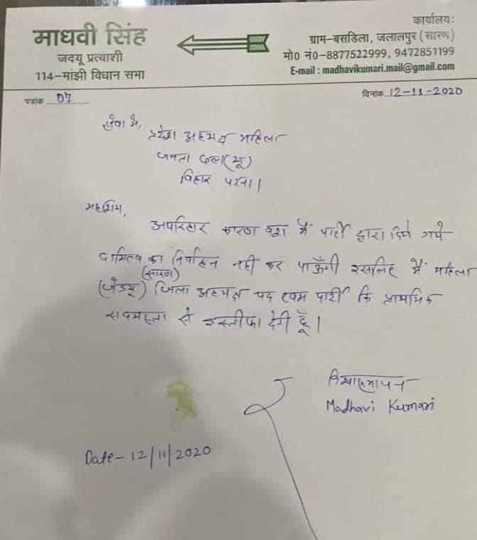 माँझी : माँझी से जनता दल यूनाइटेड के टिकट पर चुनाव लड़ने वाली माधवी सिंह ने जनता दल यूनाइटेड से इस्तीफा दे दिया है। माधवी ने अपना इस्तीफा पार्टी के प्रदेश अध्यक्ष को दिया है। प्रदेश अध्यक्ष को भेजे गए पत्र में श्रीमती माधवी सिंह ने लिखा है कि वे अब पार्टी के दायित्वों का निर्वहन करने में असमर्थ हैं। आपको बता दे कि माधवी सिंह सारण जिले में जनता दल यूनाइटेड की महिला अध्यक्ष भी थी। उन्होंने अध्यक्ष पद के साथ ही पार्टी की प्राथमिक सदस्यता से भी इस्तीफा दे दिया। अभी हाल ही में समाप्त हुवे बिहार विधानसभा चुनाव में माधवी को कुल 29155 मत मिले थे। वे माँझी से जनता दल यूनाइटेड की उम्मीदवार थीं और चुनाव में वे तीसरे स्थान पर रहीं थीं।
