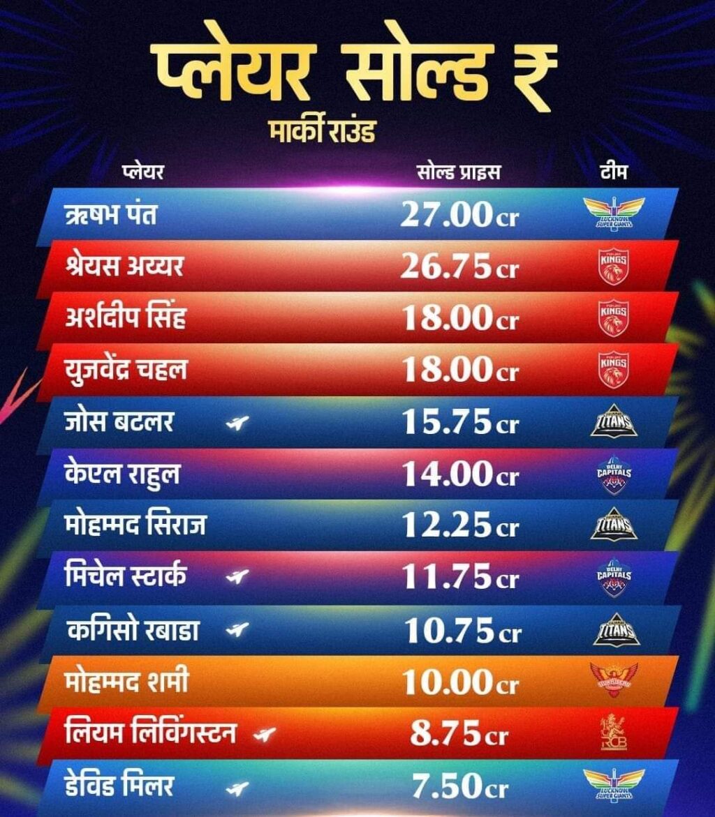 उल्लेखनीय है कि मेगा ऑक्शन में कुल 577 खिलाड़ियों पर बोली लग रही है। इनमें देशी और विदेशी दोनों खिलाड़ी शामिल हैं। ऑक्शन में 10 फ्रेंचाइजी अधिकतम 25 खिलाड़ी और कम से कम 18 खिलाड़ी खरीद पाएंगी।