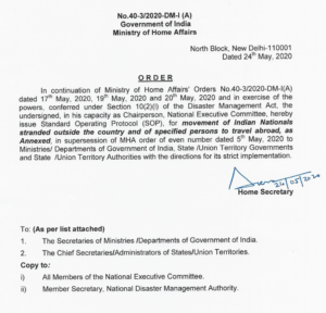 गृह मंत्रालय ने देश के बाहर फंसे भारतीय नागरिकों के साथ-साथ भारत में फंसे उन लोगों की आवाजाही के लिए भी ‘एसओपी’ जारी किया है जो जरूरी कारणों से विदेश यात्रा करने के इच्छुक हैं