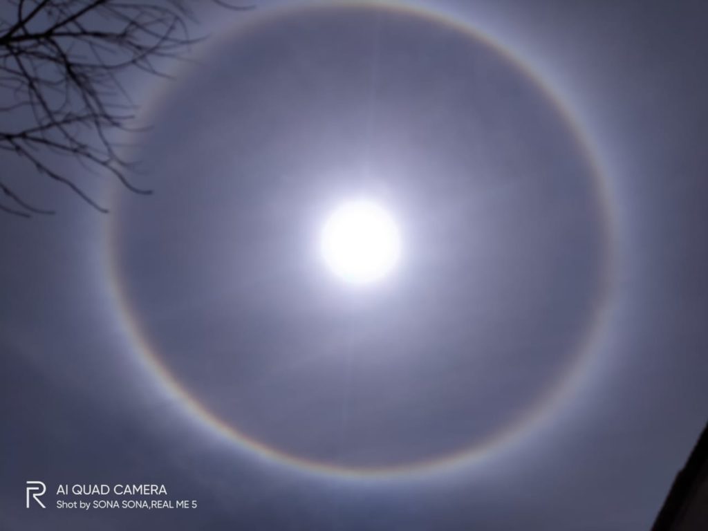 सूर्य के चारों ओर एक लाल और एक नीला वलय देखा गया. खगोल विज्ञान में इसे ‘22 डिग्री सर्कुलर हलो’ कहते हैं. ऐसा तब होता है जब सूर्य या चंद्रमा की किरणें बादलों में मौजूद षट्कोणीय बर्फ क्रिस्टलों से अपवर्तित हो जाती हैं।