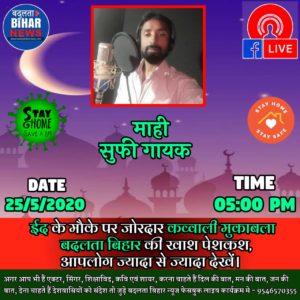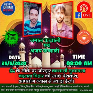 आप सभी जुड़ चुके हैं बदलता बिहार📺लाइव कार्यक्रम में हम चर्चा करेंगे कोरोना महामारी साथ ही कौव्वाली जगत की खाश पेशकश लेकर आ रहे हैं आप सबोके के बीच #चर्चित कौव्वाली गायक # जमाल व अजय अली कौव्वाल जी है तो आइये 25 मई सुबह 8 बजे #badalta bihar news चैनल के fb पेज पर लाइव जुड़ रहे है ,तो आइए ढेर सारी बाते होगी मुलाक़ात होगी