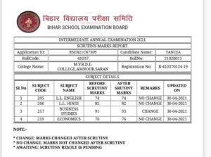 इसके लिए छात्रों को प्रति विषय 70 रुपये की फीस देनी थी. आपको बता दें की M.V.R.D E College Amnour की छात्रा तनुजा बिहार बोर्ड द्वारा जारी किया गया रिजल्ट से संतुष्ट नहीं थी तनुजा लाॅकडाउन में अमनौर काॅमर्स क्लासेज के डायरेक्टर कुंदन सर के निर्देशन में अपनी आनलाइन तैयारी किया था। तनुजा ने बताया कि उन्होंने बोर्ड परीक्षा में सभी प्रश्नों का उत्तर सही तरीके से लिखा था लेकिन अंक उम्मीद से कम प्राप्त हुआ, फिर वह स्क्रूटनी की प्रक्रिया के लिए आवेदन किए थे और पुनः बिहार बोर्ड रिजल्ट में ज्यादा अंक प्राप्त हुआ।